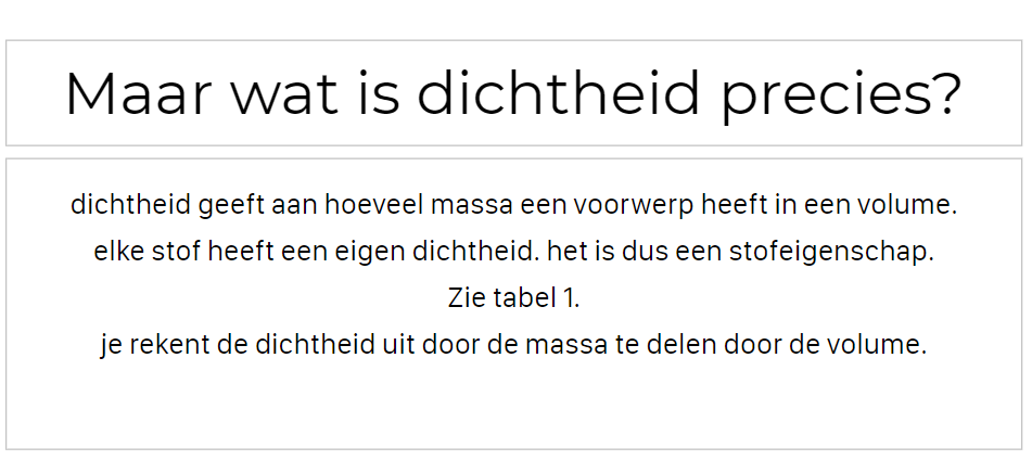 Hierna kwam een uitleg over het begrip dichtheid, met vragen over het onderwerp zodat ik controleren of de leerlingen het hadden begrepen en daarna instructie over het zelfstandig werken.